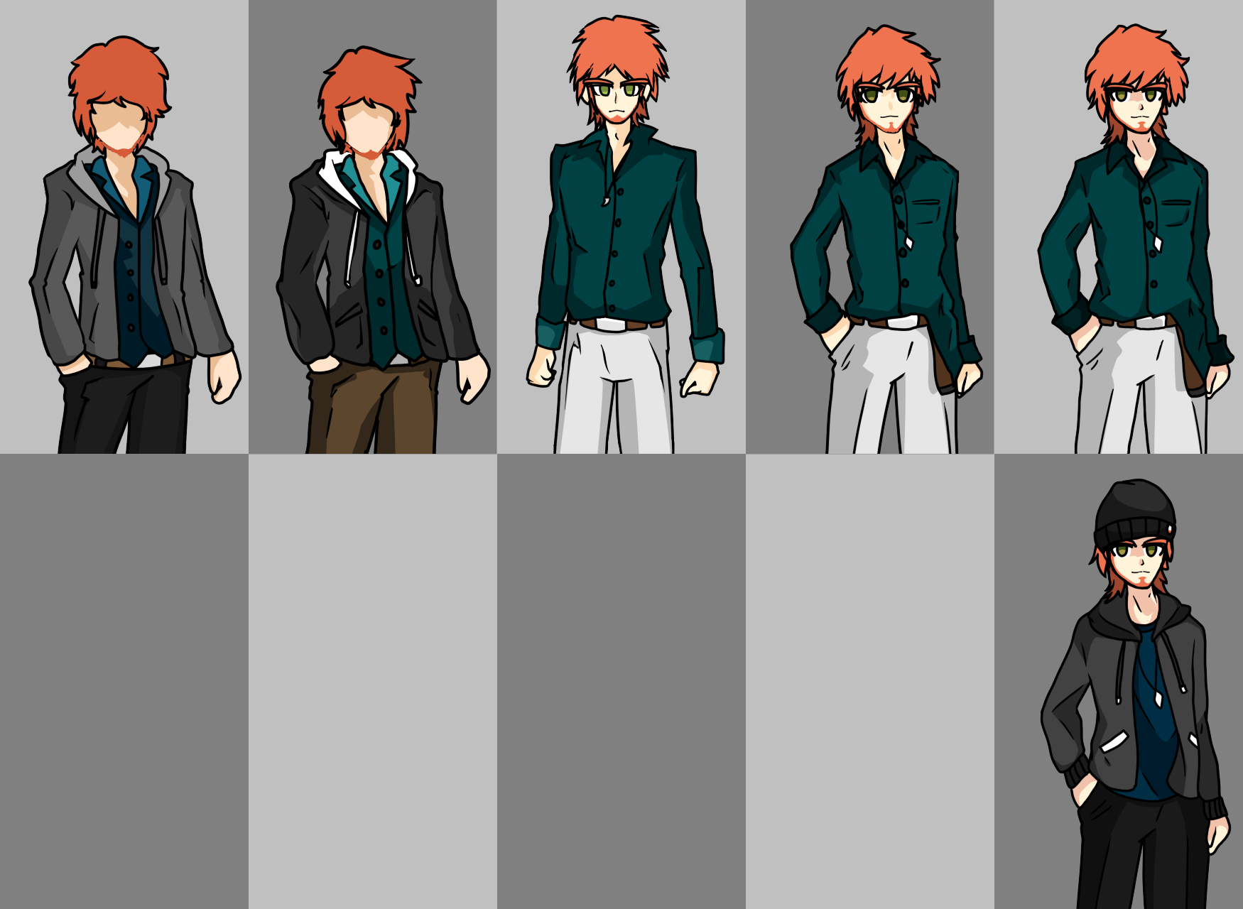 - El diseño del medio me parece haberlo hecho en 2022, y fue cuando por primera vez volvería a redibujar a todos los personajes por completo. Este es al que me gusta llamarle "Chad Klein", debido a lo fuera de lugar que se veía. El pelo era demasiado puntiagudo y los hombros muy cuadrados. Ciertamente planeaba que Klein fuese alguien atractivo y fuerte, pero algo no me terminaba de convencer. También decidí darle un collar con un diente de tiburón, para darle más personalidad. Este también sería el primer diseño de Klein con los pantalones gris claro, que se quedarían hasta la versión final.