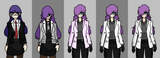 - El segundo diseño sigue la temática de oficinista, pero con una paleta de colores diferente. No recuerdo exactamente por qué quize cambiarla, quizá en ese tiempo pensé que el saco negro se veía muy aburrido y quería algo más distintivo. Cuando le mostré este diseño por primera vez a uno de mis amigos, me dijo que se parecía a Mash de Fate. Honestamente yo no le veo el parecido, allá él.